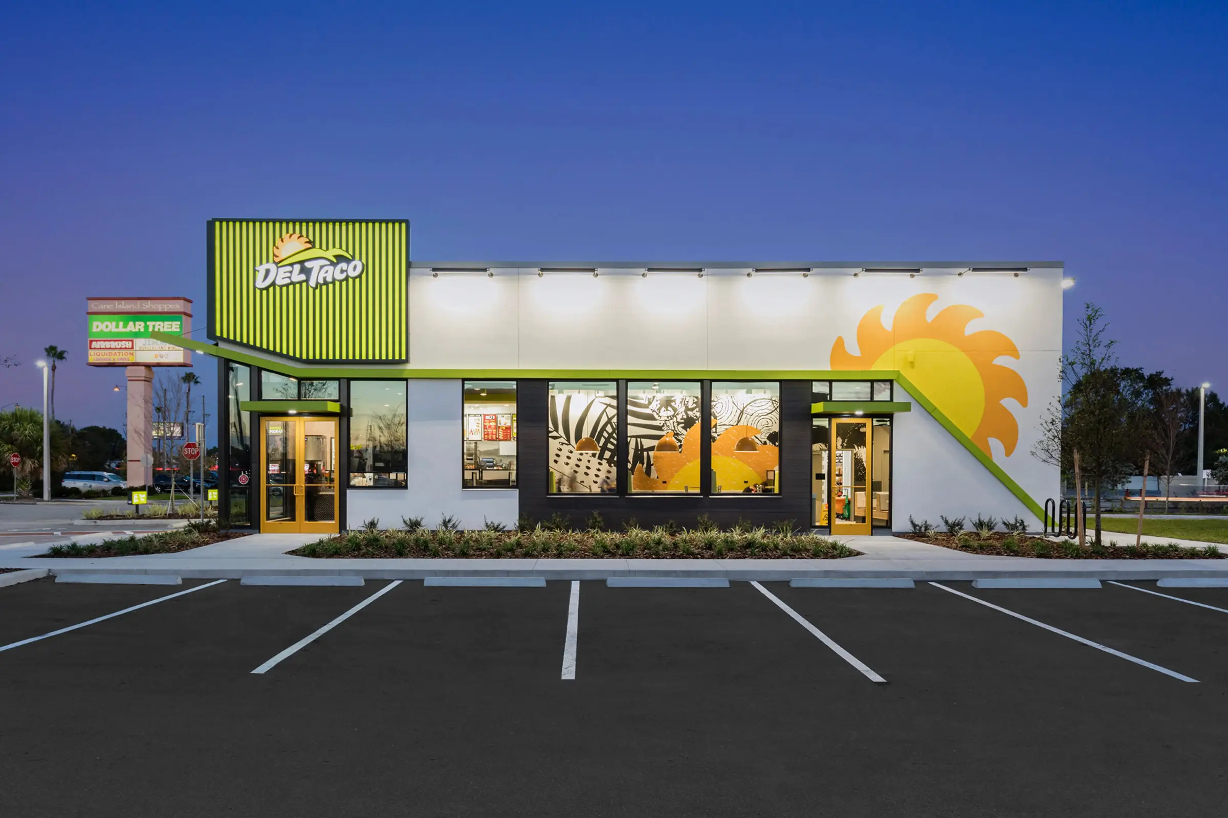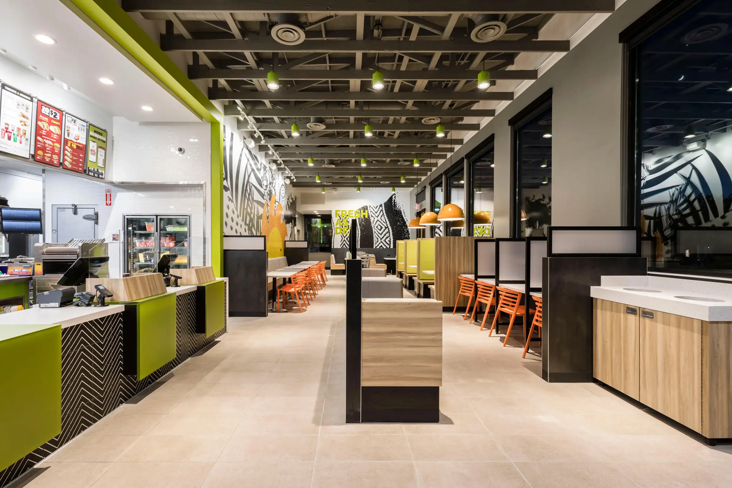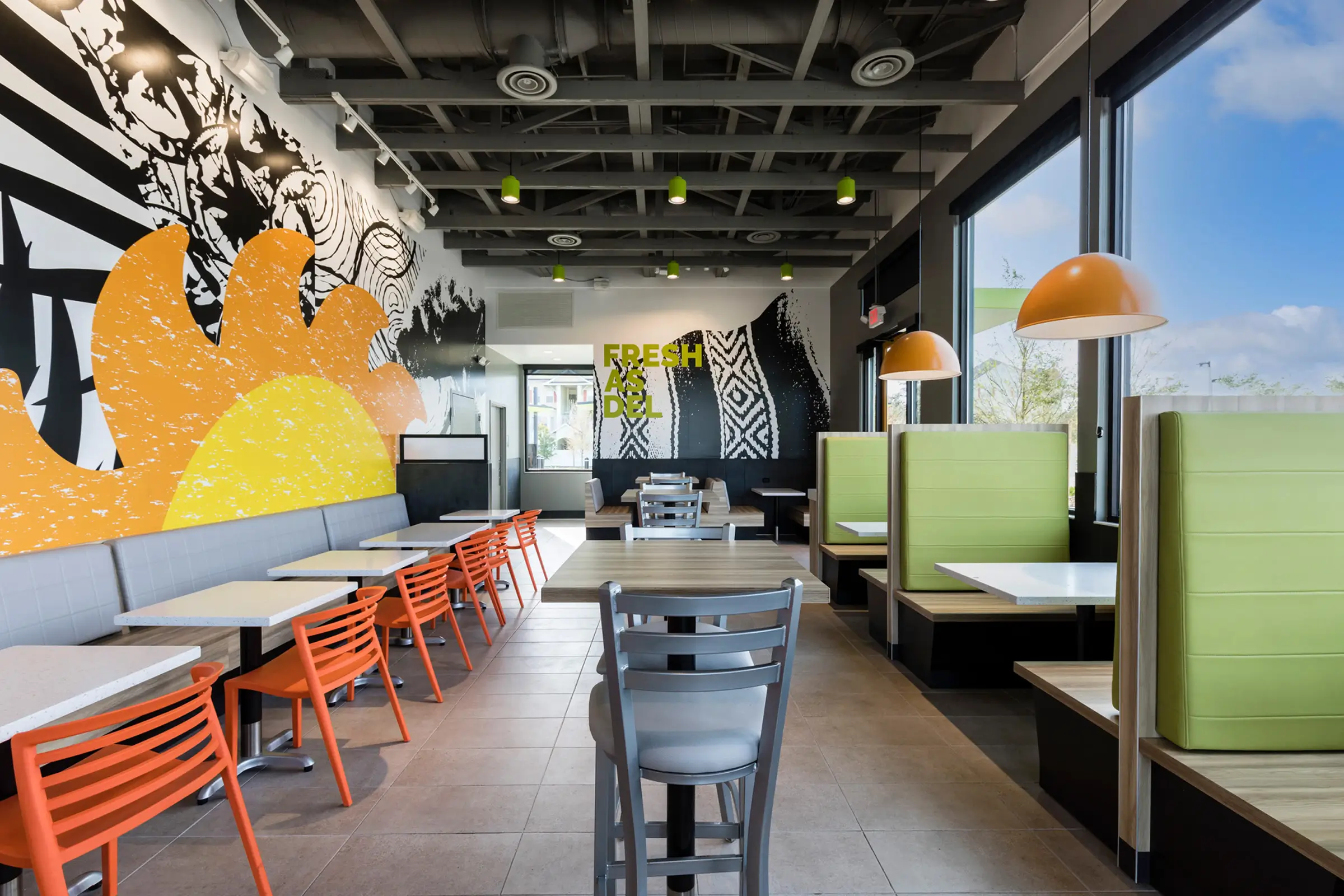 Del Taco brings a vibrant, casual vibe with pops of lime green and bright orange, energizing the space. Modern murals and patterned counter tiles add character, while statement lighting and cozy booth seating create a welcoming atmosphere for family and friends. With ample seating and a dynamic design, Del Taco offers the perfect setting for a quick and enjoyable meal.