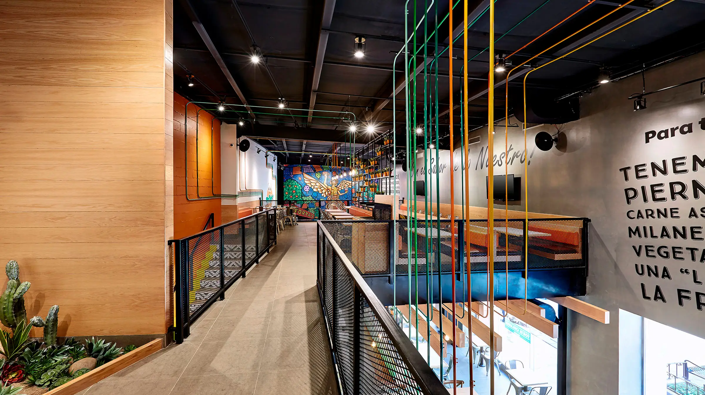 Feisty and fun, La Torta Cafe elevates the sandwich in this savory Mexicatessen. A colorful yet comfortable space in which blonde woods meet spindled sunny yellow community table legs, and concrete walls serve as a welcoming graphic menu palette. Herbaceous succulents grace towering iron section dividers while lively colors race down the walls forming a rainbow of metal tubing cascading down to reveal a pop of welcoming lights. A bright mural watches over a long banquette on the top floor while additional bands of color and light await below.